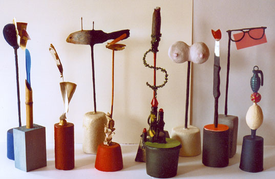 Serien "Vanity fair" und "Machtstäbe - Zepter", 2001 - 2006, Objektmontagen mit Gips, Fundstücken, diversen Materialien, bis ca. 50 cm Höhe