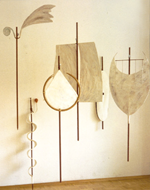 Serie "Äolus - Windstäbe", 1999, ca. 70 bis 140 cm Höhe, Baustahl, Papier, Farbe